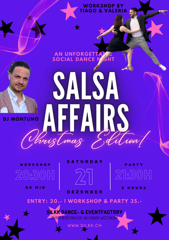 SALSA AFFAIRS - CHRISTMAS EDITION am Samstag 21. Dezember 2024 DJ MONTUNO all Night long! Elegante Location, top DJ und die besten Social Dances die du dir wünschen kannst - Was gibt es Schöneres, um die Feiertage einzuläuten? Unser Label SALSA AFFAIRS bietet dir in einmaliger Atmosphäre, mit bestem Tanzboden weit und breit alles, was das Social Dance Herz begehrt. Als Warm Up findet vor der Party ein Workshop statt und danach ist tanzen, tanzen, tanzen zu feinstem Salsa und Bachata. Wir freuen uns darauf mit euch die Festtagszeit einzuläuten! ________________________________________________________________________ PREIS Eintritt: 20.- Workshop & Party: 35.- PROGRAMM Workshop Time: 20:30- 21:25 Social Dancing: 21:30- 03:00 (Einlass um 20:30 nur für Workshop Teilnehmer. Für Party-Gäste ist der Einlass ab 21:30 <3) WORKSHOP INFOS Samstag 21. Dezember 2024 Art: Salsa Partnerwork Intermediate Teacher: Tiago (Vive Bailando) & Valeria (Aurora Dance) MUSIC Salsa und Bachata von DJ MONTUNO https://fb.me/e/5HVhiu2e0