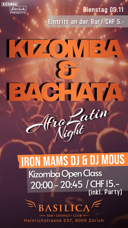 DIENSTAG 05. November 2024 - KIZOMBA Open Class mit IRON MAMS - MUSIC by Iron Mams DJ & DJ Mous Workshop from 20:00h - 20:45h / CHF 15.- (inkl. Eintritt) Party ab 20:50h - ca. 00:00h (Party Eintritt CHF 5.-) "Das BASILICA ist am Dienstag schon ab 17:00h für alle geöffnet". _____________________________ BASILICA - BAR * LOUNGE * CLUB Heinrichstrasse 237 8005 Zürich https://www.facebook.com/events/1577243539667818