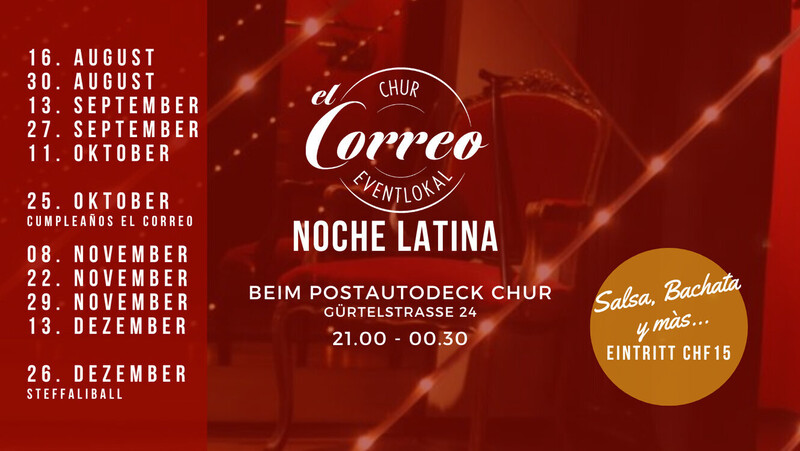 Der Latin-Tanzabend in Chur. Die beliebte Noche Latina im El Correo Chur am Postautodeck. Jeden 2. Freitag im Monat legen DJ's aus Chur, Zürich, Liechtenstein oder Deutschland auf. Tanzen zu heissen Rhytmen und den Tanzboden zum glühen bringen. Und wem es zu heiss wird, der kann sich an der Bar mit einem kühlen Drink abkühlen. Ab CHF 15.00 https://www.elcorreo.ch