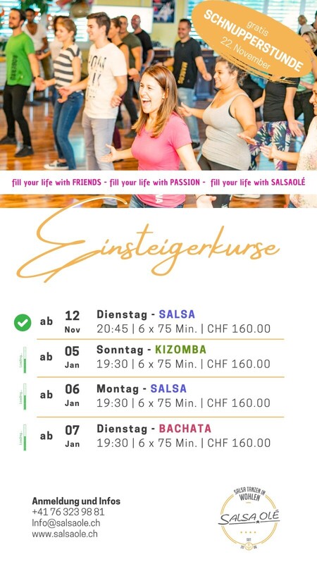 Wir sind überzeugt: Kizomba ist lernbar! Du bringst jede Menge Freude an Tanz und Musik sowie eine Prise Geduld mit, wir liefern dir ein gut durchdachtes und funktionierendes Konzept. Egal ob jung oder alt, Anfänger oder Fortgeschritten, Salsa, Bachata oder Kizomba, in unseren regulären Kursen und Workshops bieten wir für jedes Bedürfnis etwas Passendes! Salsa ist sicher die grösste unserer Leidenschaften und wir lieben und beherrschen jeden der 3 populärsten Salsa Stile gleichermassen. Jeder hat seinen Reiz und lässt dich die Musik auf verschiedene Weise interpretieren, weshalb wir alle drei Stile unterrichten und fördern. Für diesen Einsteigerkurs benötigst du keine Vorkenntnisse und wir freuen uns, dir das Tanzen Schritt für Schritt beizubringen :) https://salsaole.ch/
