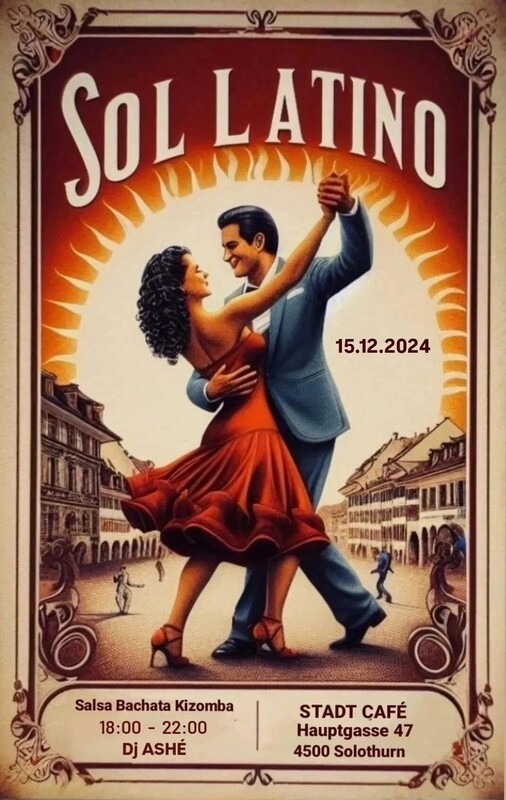 Wir laden Sie ein, zu tanzen und gemeinsam einen schönen Latin-Abend zu genießen. Wir werden zu bekannten Rhythmen tanzen. Salsa . Bachata . Kizomba . Dj Ashé . Wir freuen uns auf Euch. STADT CAFÉ Hauptgasse 47,4500 Solothurn Die schönste Barockstadt der Schweiz