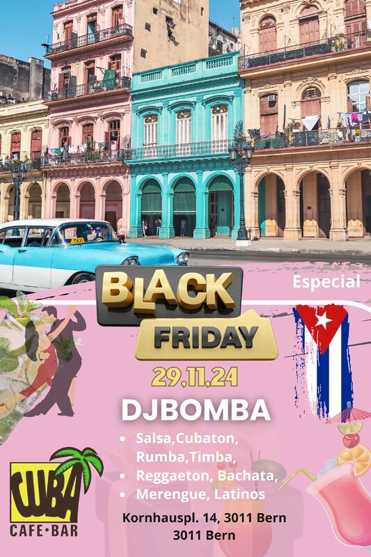 🔥Viernes 29 de noviembre edición Black Friday con la mejor música de Cuba y latinoamérica Salsa, Bachata, merengue, timba, cubatón, Dembow, reggaeton, cumbia Des las 22:30 hasta 00:00 100%Salsa, Bachata, Kizomba, Desde las 00:00 100% latino Party Música con (DjBomba) Cuba Bar Bern ********************* Friday, November 29th Black Friday edition with the best music from Cuba and Latin America Salsa, Bachata, merengue, timba, cubatón, Dembow, reggaeton, cumbia. From 22:30 to 00:00 100%Salsa, Bachata, Kizomba, From 00:00 100% Latin Party Music with (DjBomba) Cuba Bar Bern djbomba.net