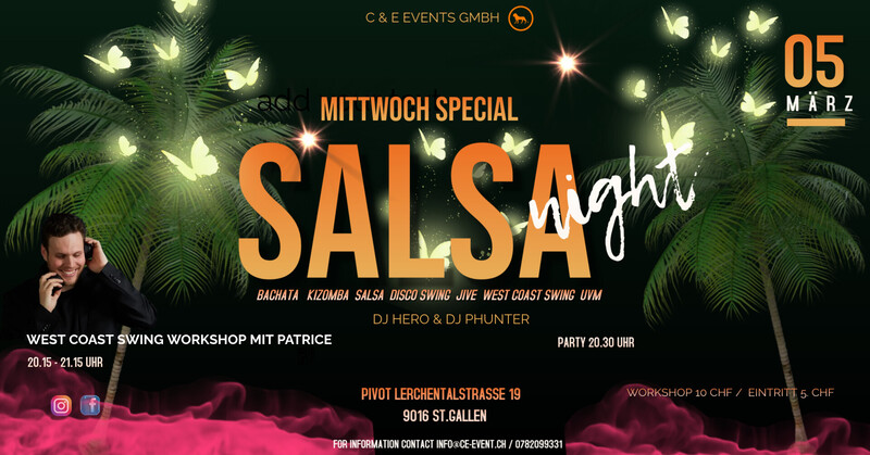 Lasst uns abtanzen und das Leben feiern Mittwochs mit DJ Phunter und DJ Hero in St.Gallen im Pivot 🙂 West Coast Swing Workshop mit Patrice von 20.15 - 21.15 Uhr!!!! Workshop 10 CHF /Eintritt 5.00 CHF Für weiter Auskünfte: Phone 078 209 93 31 oder per Mail an info@ce-events.ch Wir freuen uns auf einen schönen Abend mit Euch! https://ce-events.ch