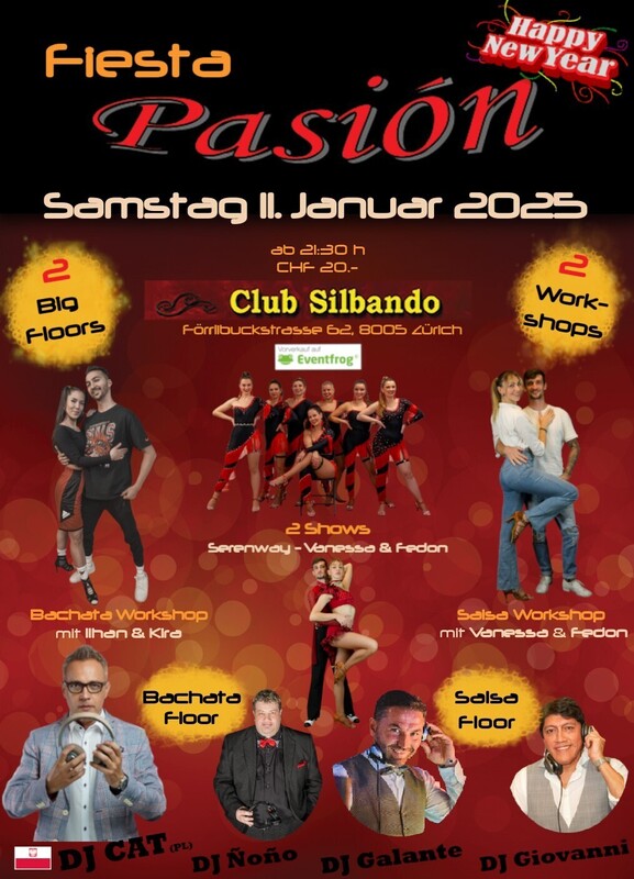 Welcome 2025! New Year's Special mit DJ Cat (PL) Auch im 2025 geht es weiter mit der Fiesta Pasión - Deine Social-Dance Party am 2. Samstag des Monates im Club Silbando! Im Rahmen dieses New Years' Special haben wir gleich 4 DJs am Start... u.a. DJ Cat aus Polen!! Das erwartet dich... *2 Workshops*: Vor der Party finden von 20:30 - 21:30 Uhr zwei Workshops statt (CHF 30.- inkl. Party-Eintritt): - Bachata Workshop mit Ilhan und Kira https://eventfrog.ch/de/p/kurse-seminare/musik-tanz/bachata-workshop-mit-ilhan-kira-7263569225133794072.html - Salsa mit Vanessa & Fedon https://eventfrog.ch/de/p/kurse-seminare/musik-tanz/salsa-workshop-mit-vanessa-fedon-7263569748750711661.html *2 Big Floors*: - Floor 1: Bachata mit DJ Cat (PL) und DJ Ñoño - Floor 2: Salsa mit DJ Galante und DJ Giovanni *2 Shows*: - Vanessa & Fedon - Salsa-Floor (23:45 Uhr) - Serenway - Bachata-Floor (00:15 Uhr) Abendkasse: 20.- CHF Vorverkauf: https://eventfrog.ch/de/p/party/latin-brasil/fiesta-pasion-new-year-s-special-mit-dj-cat-pl-7263568282573076003.html ------------------------------ WHATSAPP/TELEGRAM: Komm in die WhatsApp- oder Telegram-Gruppe und bleibe über die kommenden Events informiert: Whatsapp: https://chat.whatsapp.com/DHgqcB4Pe8aFmjpYt2v03c Telegram: www.t.me/fiestapasion ------------------------------ Fiesta Pasión Daten 2025: (jeweils am 2. Samstag des Monates) 08.02.2025 08.03.2025 12.04.2025 10.05.2025 14.06.2025 12.07.2025 Sommerpause 13.09.2025 11.10.2025 08.11.2025 13.12.2025 ------------------------------ Euer Fiesta Paión Team #bachata #salsa #dance #bachatasensual #bachatadancing #kizomba #merengue #bachatadance #reggaeton #salsadancing #bachatalove #dancer #music #bachatafusion #dancing #hiphop #dancers #bachatalovers #latindance #bachateros #bachatadominicana #musica #love #baile #socialdance #bachatadancers #latino #salsacubana #dembow #romeosantos https://eventfrog.ch/de/p/party/latin-brasil/fiesta-pasion-new-year-s-special-mit-dj-cat-pl-7263568282573076003.html
