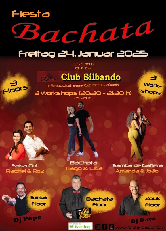 Fiesta Bachata - Deine Social-Dance Party am 4. Freitag des Monates im Club Silbando! Mit 3 Workshops und 3 Floors! Das erwartet dich: *3 Workshops* von 20:30 - 21:30 Uhr (CHF 25.- inkl. Party-Eintritt): - Bachata mit Tiago & Lisa (Vive Bailando) Vorverkauf: https://eventfrog.ch/de/p/kurse-seminare/musik-tanz/bachata-workshop-mit-tiago-lisa-vive-bailando-7268960811107699224.html - Salsa mit Rachel und Roz (Rhythmia) Vorverkauf: https://eventfrog.ch/de/p/kurse-seminare/musik-tanz/salsa-on1-workshop-mit-rachel-roz-rhythmia-7268961286204906392.html - Samba de Gafieira Workshop (Beginner) mit Amanda & João Vorverkauf: https://eventfrog.ch/de/p/kurse-seminare/musik-tanz/samba-de-gafieira-workshop-beginner-mit-amanda-joao-7268959646395605721.html *3 Floors* Party ab 21:30 Uhr (CHF 15.-): - Floor 1: Bachata mit DJ Ñoño - Floor 2: Salsa mit DJ Pepe - Floor 3: Zouk mit DJ Dave Detailliert Infos zu Workshops und DJ's werden zeitnah folgen. Vorverkauf Workshops und Party-Eintritt via Eventfrog: https://eventfrog.ch/de/p/party/latin-brasil/fiesta-bachata-7268961525343151756.html ●●● WHATSAPP/TELEGRAM: Komm in die WhatsApp- oder Telegram-Gruppe und bleibe über die kommenden Events informiert: Whatsapp: https://chat.whatsapp.com/DHgqcB4Pe8aFmjpYt2v03c Telegram: https://www.t.me/fiestapasion ●●● Fiesta Bachata Daten 2025: jeweils am 4. Freitag des Monates 28.02.2025 28.03.2025 25.04.2025 23.05.2025 27.06.2025 Sommerpause 22.08.2025 26.09.2025 24.10.2025 28.11.2025 26.12.2025 ●●● Euer Fiesta Pasion Team #bachata #salsa #dance #bachatasensual #bachatadancing #kizomba #merengue #bachatadance #reggaeton #salsadancing #bachatalove #dancer #music #bachatafusion #dancing #hiphop #dancers #bachatalovers #latindance #bachateros #bachatadominicana #musica #love #baile #socialdance #bachatadancers #latino #salsacubana #dembow #romeosantos https://eventfrog.ch/de/p/party/latin-brasil/fiesta-bachata-7268961525343151756.html