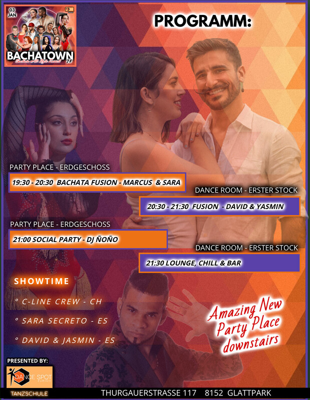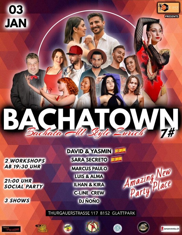 WIR SIND FROH UNSERE WUNDERSCHÖNE NEUEN PARTY LOKAL UND EVENT STRUKTUR ZU PRÄSENTIEREN! Bei diesem Event, welches, immer am ersten Freitag jedes zweite Monat stattfindet, wird zu 100% Bachata gespielt. Bei jeder Bachatown Edition erwarten euch andere Artists und DJs. Besonders die nationalen und internationalen Artisten und DJs machen diese Eventreihe zu einem einzigartigen Erlebnis. Die DSZ Tanzschule ist darauf bedacht, aktuelle, relevante und vor allem qualitative Lineups für euch vorzubereiten. CASTING: • David & Yasmin ( ES 🇪🇦 ) • Sara Secreto ( ES 🇪🇦 ) • Marcus Paulo • Ilhan & Kira • Luis & Alma • C-line Crew PROGRAMM: • "Türöffnung 19:00 WORKSHOPS - 1. Stock - Raum 188 19:30 - 20:30 - BACHATA FUSION by Marcus Paulo & Sara Secreto (CH ES 🇨🇭 🇪🇦) 20:30 - 21:30 - BACHATA SENSUAL by David & Yasmin (ES 🇪🇸) ____________________________________ ★ 21:00 - SOCIAL PARTY TIME - ERDGESCHOSS Musik 100% Bachata All Style mit DJ Ñoño 🇨🇭 ____________________________________ ★ SHOWTIME: • David & Yasmin (🇪🇦 ES) • Sara Secreto (🇪🇸 ES) • C-Line Crew ___________________________________ 📌 LOKAL: Dance Spot Zurich Thurgauerstrasse 117, 8152 Zürich TMC Fashion Gebäude ____________________________________ https://eventfrog.ch/bachatown