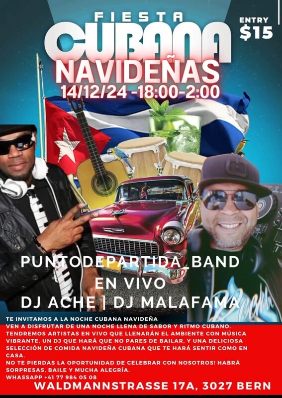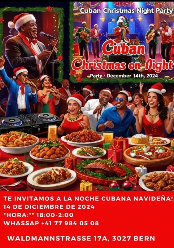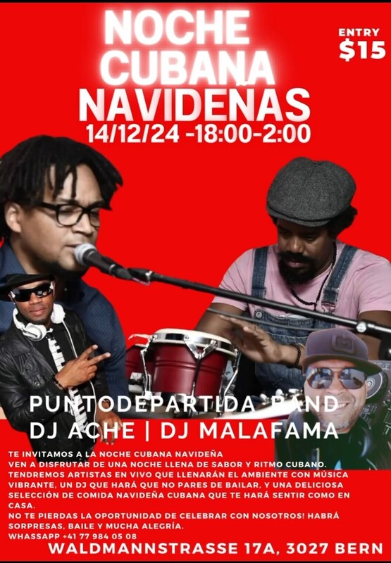 Wir laden Sie ein zum gemeinsamen Tanzen und Genießen Kubanische Weihnachtsnacht . Punto de Partida Band . Live Musik: Dj Ashé & Dj Malafama Salsa . Bachata . Timba . Merengue . Kizomba . Son . Cubaton . Viele Solpresas für diesen großartigen Abend. Gastronomie : Essen : Kubanisch und Dominikanisch . Wir freuen uns auf Euch .
