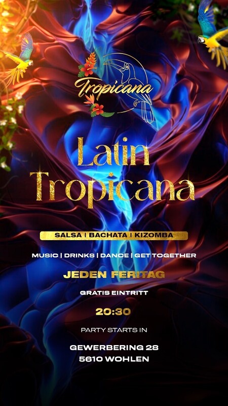 Jeden Freitag Abend wird im Tropicana getanzt! Der Eintritt ist gratis und es sind auch Tanzlehrer vor Ort. Ab 20.30 Uhr in Wohlen im Aargau wird ordentlich gefeiert. Es ist ein exklusiver Abend, welcher voller positiven Vibes, Spass und Lebensfreude dominiert wird, wo man in Ruhe üben/trainieren und sich unter Tänzer austauschen kann. Nimm deine Liebsten mit und geniesse die erstklassige Atmosphäre in Wohlen im Tropicana. ​Gratis Garderobe Es stehen ca. 40 gratis Aussenparkplätze vor dem Eingang und weitere 30 gebührenpflichtige in unmittelbarer Nähe zur Verfügung. Das Tropicana befindet sich im Industriegebiet und hat genügend Platz für alle Besucher. Du findest nicht alle Infos auf dem Flyer? Gerne kannst du uns über info@tropicanaclub.ch kontaktieren. ​=== TROPICANA === Gewerbering 28 | 5610 Wohlen | Aargau https://tropicanaclub.ch/next-events.html