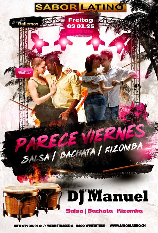 Die richtige Party, um das Wochenende zu beginnen. Mit wechselnden DJ`s immer Salsa, Bachata und Kizomba und auch mal Reggaeton. DJ Manuel: Salsa, Bachata, Kizomba Free Parking vor dem Club und mit dem ÖV ist das Sabor Latino einfach erreichbar bis Haltestelle Grüzenstrasse oder Brücke. Auch die Nachtbusse fahren im 1/2 Stundentakt an und ab diesen Haltestellen. Im Sabor Latino gibt es auch eine Tanzschule: www.bailemos.ch www.saborlatino.ch
