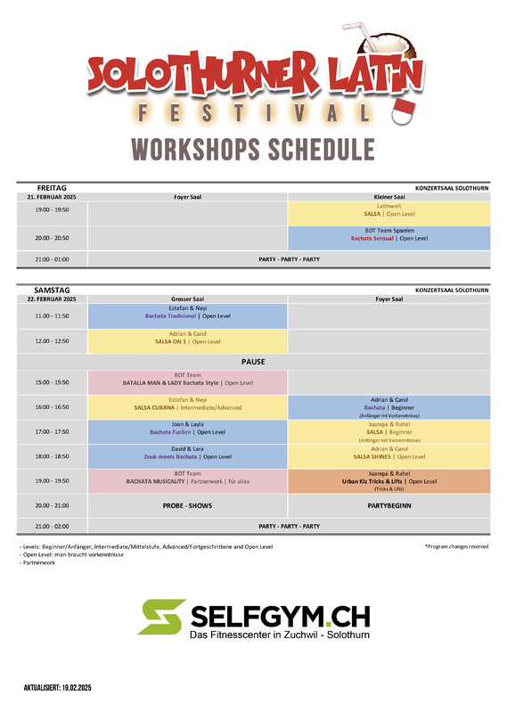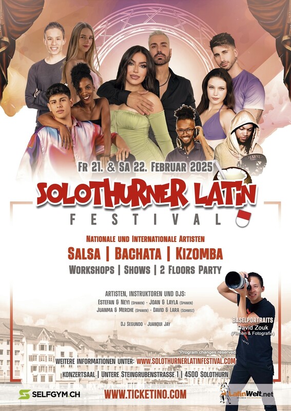 Solothurner Latin Festival 2024 Herzlich Willkommen zum 5. Salsa-Festival in der schönsten Barockstadt der Schweiz, Solothurn. Es erwarten Euch 2 Tage mit Workshops mit nationalen und internationalen Instruktoren und am Abend Partys und Shows. Wir freuen uns auf einigen Tage voller Freude, Spass und heissen Rhythmen wunderschönen Konzertsaal in Solothurn. Solothurner Latin Festival 2025 🇨🇭 🫵🏽Jetzt Ticket kaufen 👉🏾https://www.ticketino.com/de/Event/Solothurner-Latin-Festival-2025/188723 -------------------------- ★★★ ARTISTEN ★★★ -------------------------- Joan & Layla (Spanien) 🇪🇸 Juanma & Merche (Spanien) 🇪🇸 Estefan & Neyi (Spanien) 🇪🇸 David & Lara (Basel) 🇨🇭 und mehr! ★ DJs: Dj Juanqui Jay (Ecuador/St. Gallen) 🇨🇭 Dj Segundo (Ecuador/SO) 🇨🇭 Dj Zoltan 🇨🇭 ---------------------------- ★★★ PROGRAMM ★★★ ---------------------------- FREITAG, 21. FEBRUAR 2025 Ab 18:00 Uhr // Türöffnung, Abendkasse, Registrierung und Abholung der Tanzpässe. Ab 19:00 - 21:00 Uhr, Workshops Ab 21:00 - 01:00 Uhr, Party auf 2 Floors. Ca. 22:30 Uhr, Show Demo, Präsentation von Artisten. SAMSTAG, 22. FEBRUAR 2025 Ab 10:00 Uhr // Türöffnung, Abendkasse, Registrierung und Abholung der Tanzpässe. Ab 11:00 - 20:00 Uhr, Workshops Ab 20:00 - 02:00 Uhr, Party auf 2 Floors: - Ab 20:00 Uhr Foyer Saal (Kizomba) - Ab 21:00 Uhr Grosser Saal: Salsa & Bachata ca. 23:30 Uhr Shows im grossen Saal ----------------------- ★★★ PREISE ★★★ ----------------------- im Vorverkauf und Abendkasse 👉🏽FULLPASS: Alle Workshops, Partys und Shows (FREITAG und SAMSTAG) CHF 115.- VVK bis 20.02.2025, 23:59 Uhr // Alle Workshops + Partys + Shows CHF 120.- Abendkasse // Alle Workshops + Partys + Shows 👉🏽PARTY FULLPASS: Partys und Shows (FREITAG & SAMSTAG) CHF 30.- VVK bis 20.02.2025, 23:59 Uhr // Alle Partys + Shows CHF 35.- Abendkasse // Alle Partys + Shows ******************** ★FREITAG 21. FEBRUAR 2025 👉🏽FULLPASS FREITAG (2 Workshops + Party am Freitag) CHF 50.- VVK bis 21.02.2025, bis 15:00 Uhr // Alle Workshops + Party CHF 60.- Abendkasse // Alle Workshops + Party 👉🏽Weitere Vorverkaufspreise auf: https://www.solothurnerlatinfestival.com/tickets ⚠️Note: An der Abendkasse werden alle Preise für die Workshops CHF 12.- Party VVK, CHF 15.- Abendkasse. ******************** ★SAMSTAG 22. FEBRUAR 2025 👉🏽FULLPASS SAMSTAG (Alle Workshops + Shows + Party am Samstag) CHF 90.- VVK bis 21.02.2025, bis 23:59 Uhr CHF 100.- Abendkasse // Alle Workshops + Party + Shows CHF 40.- 1 Workshop + Party am Samstag CHF 55.- 2 Workshops + Party am Samstag CHF 70.- 3 Workshops + Party am Samstag 👉🏽Weitere Vorverkaufspreise auf: https://www.solothurnerlatinfestival.com/tickets CHF 20.- Party VVK bis 22.02.2025, 10:00 Uhr. // AK. CHF 22.- ******************** ------------------------------ ★★★ PROMO CODE ★★★ ------------------------------ Promocode: latinwelt25 // Für Fullpass, Samstag Fullpass // CHF 15.- günstiger -Mit mehreren Aktionscodes erhalten Sie 15 % Ermäßigung! Schauen Sie einfach genau hin oder fragen Sie uns! -Several promo codes give you 15% reductions! Just look carefully or ask us -------------------------- ★★★ ADRESSE ★★★ -------------------------- Konzertsaal, Untere Steingrubenstrasse 1, 4500 Solothurn ------------------------------------------ ★★★ WEITERE INFORMATIONEN ★★★ ------------------------------------------ ★Garderobe obligatorisch CHF 3.- (Gratis mit Fullpass) ★10 Minuten zu Fuss vom Hauptbahnhof Solothurn zum Konzertsaal Solothurn. ★Verschiedene Parkmöglichkeiten (z.B. Parkhaus Baseltor 4 Min., Parkhaus Berntor 6 Min.) ★Verpflegungsmöglichkeit im Konzertsaal Solothurn. 🫵🏽Jetzt Ticket kaufen https://www.ticketino.com/de/Event/Solothurner-Latin-Festival-2025/188723 *Programmänderung vorbehalten *Program changes reserved.