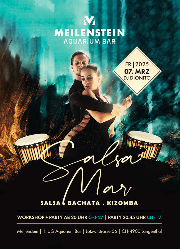 💃 Salsa Mar 💃 Die Bar im 1.UG ist das Glanzstück des Aquariums Langenthal. Süsswasserbecken auf 42 Metern Länge verzaubern die Gäste von der ersten Sekunde an. Unterwasserwelten vom Amazonas bis nach Siebirien mit atemberaubenden Flussmonstern und farbengewaltigen Amazonasfischen können hier trockenen Fusses bestaunt werden. Freuen Sie sich bei. 💃Salsa Mar💃 Auf einen Workshop für Tanzbegeisterte ab 20.00-20.45 und anschliessend 20.45 auf eine heisse Party In beeindruckender Kulisse bis 02.00 Workshop & Party. 27.- 20.00-02.00 /Party 17.- 20.45-02.00 💃Salsa Workshop 💃 Mit Stephan & Tanzpartnerin Freundlich erwarte ich Dich auf eine weitere Unvergessliche Party Lg Reto & Team htpps.// www.dermeilenstein.ch