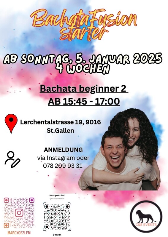 Lerne Bachata tanzen – jetzt in St. Gallen! Du möchtest Bachata lernen, Spass haben und neue Leute treffen? Am Sonntag, den 05.01.2025, startet unser Bachata Beginner 2 Tanzkurs in St. Gallen – und das Beste: Du kannst ohne einen Tanzpartner kommen! Warum Bachata? Einfache Schritte für Anfänger Perfekt für Fitness und Beweglichkeit Entspannter Einstieg in die Welt des Tanzens Wann & Wo? Start: Sonntag, 05.01.2025 Ort: St. Gallen Lerchentalstrasse 19 Für Wen? Alle Tanzbegeisterten, egal ob allein oder mit Partner Grundschritte Jetzt anmelden & deinen Platz sichern! Melde dich noch heute an und entdecke, wie viel Freude Bachata bringen kann. Plätze sind begrenzt! Schreibe für weitere Infos und Anmeldung: 078 209 93 31 oder 079 315 99 55 Teile diesen Beitrag und lade deine Freunde ein – zusammen tanzt es sich noch schöner! https://ce-events.ch