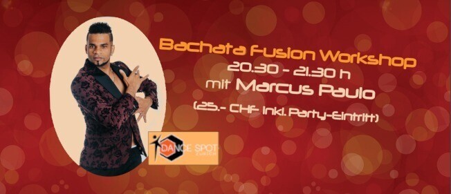 Bachata Fusion Workshop mit Marcus Paulo (Dance Spot Zürich) inkl. Party-Ticket für Fiesta Pasión Lerne neue Bachata Fusion Figuren mit Marcus Paulo (Dance Spot Zürich) und tanze diese gleich anschliessend an der Fiesta Pasión ab 21:30 Uhr mit drei Floors u.a. Bachata-Floor mit DJ Desea! Workshop inkl. Party-Eintritt für 25.- CHF Abendkasse oder Vorverkauf via Eventfrog: https://eventfrog.ch/de/p/kurse-seminare/musik-tanz/bachata-fusion-workshop-mit-marcus-paulo-dance-spot-zuerich-7279608075538911020.html https://eventfrog.ch/de/p/kurse-seminare/musik-tanz/bachata-fusion-workshop-mit-marcus-paulo-dance-spot-zuerich-7279608075538911020.html