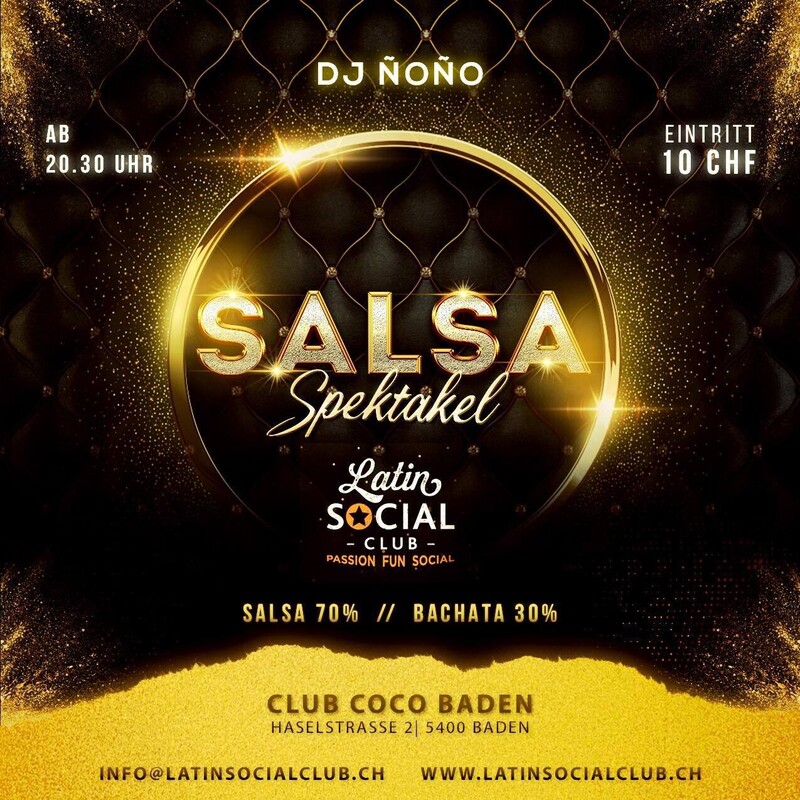 Herzlich willkommen bei Latin Social Club! Wir sind Veranstalter diverser Events für Liebhaber der latinoamerikanischen Musik/des latinoamerikanischen Tanzes im Aargau. Zum Abschluss der Woche die heissen Rhythmen der lateinamerikanischen Musik nochmals erleben. Du wirst es spüren, ob an der Bar oder auf der Tanzfläche mit deinem Gegenüber, das geheimnisvolle, faszinierende Etwas, dass das Salsaspektakel ausmacht. Zudem heizt unser DJ dem Drang zu Tanzen ordentlich ein und sorgt dafür, dass der Club lebt!! In den schönen Räumlichkeiten des Clubs COCO, im Gran Casino Baden, wird jedes Tanzfeeling noch verstärkt. Das Elegante Ambiente, das durchdachte Konzept und das Echtholzparket machen den Club COCO zum perfekten Ort zum Tanzen. Euer Latin Social Club Team Eintritt nur Barbezahlung möglich. www.latinsocialclub.ch