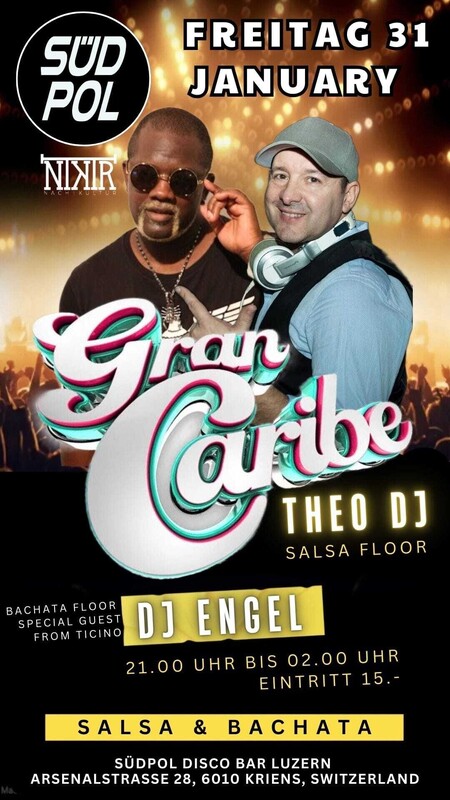 -- Freitag 31. Januar -- Welcome 2025 ★ Fiesta GRAN CARIBE ★ 2 Dance Floors - Salsa & Bachata Tanzen im Südpol! Luzern ---------------------------------------------- ★ SALSA FLOOR: Salsa All Styles mit DJ THEO (Luzern) ★ BACHATA FLOOR: Bachata All Styles mit DJ ENGEL (Tessin) ---------------------------------------------- 21.00 Uhr bis 02.00 Uhr EINTRITT 15.- Das Zentrum für Kultur in der Zentralschweiz. Mehrspartenhaus mit Tanz, Theater, Musik und Club. ★ SÜDPOL Arsenalstrasse 28, 6010 Kriens, www.sudpol.ch ------------------------------------------------ "ANREISE WICHTIGE INFORMATIONEN" ---------------------------------------- Die Anfahrt mit Fahrrad oder ÖV wird empfohlen. Eine Wegbeschreibung findest Du via Google Maps. VELO: Vor und hinter dem Gebäude befinden sich ca. 200 Fahrradparkplätze. Vom Stadtzentrum Luzern ist der Südpol in etwa zehn Minuten via Freigleis zu erreichen. ÖV: Der Bus Nr. 14 fährt ab Bahnhof Luzern Richtung Horw Zentrum und hält direkt vor dem Haus. Die Haltestelle heisst Südpol. AUTO: Es steht nur eine beschränkte Anzahl Autoparkplätze für den Südpol zur Verfügung. Diese befinden sich unter dem neuen LSO-Gebäude und zwischen Metzger Center Zentralschweiz und dem neuen Backsteingebäude der Hochschule Musik Luzern. Die Parkplätze auf dem Vorplatz des Metzger Center Zentralschweiz stehen den Südpol-Besucher*innen nicht zur Verfügung. Als Ausweichmöglichkeit empfehlen wir das "Parkhaus Nidfeld". https://fb.me/e/8nC2NzPhz