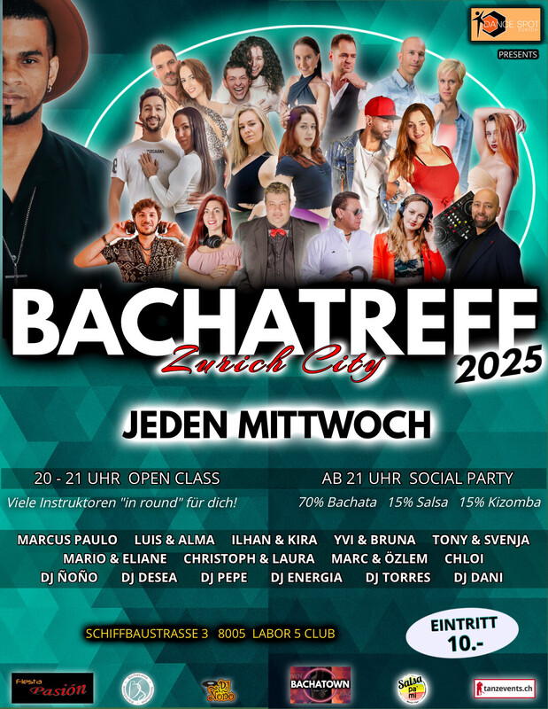 2025 ERWARTET EUCH BACHTREFF IM NEUEN FORMAT! Hola Bachateros & Bachateras! BACHATREFF öffnet seine Türen im neuen Jahr für euch mit einem neuen Konzept. Die Tanzszene in der Schweiz wächst und gedeiht. Es ist uns wichtig, euch die gewohnte Qualität des Events zu bieten, dabei aber auch die Vielfalt des aktuellen Angebots zu unterstützen, einen guten Austausch zwischen den Tänzern zu ermöglichen und auch vielversprechenden neuen Lehrern und Instruktoren die Möglichkeit zu geben, ihr Wissen und ihre Begeisterung für Bachata mit euch zu teilen. WHAT IS NEW: Für die Workshops haben wir viele verschiedene Instruktoren "in round" für euch. Auch für die anschliessende Party werden die DJs im Wochentakt rotieren. Zusätzlich haben wir unsere Preise zurück auf den ursprünglichen Eintrittspreis angepasst. Bachatreff ist ein von Dance Spot Zürich organisiertes Event, welches jeden Mittwoch in Zürich stattfindet. Seit nun bereits mehr als 7 Jahren bringen wir neue Tänzer auf die Tanzflächen. Make it your second home! _________________________________________________________ WOCHENPLAN *************** ° 20:00 BACHATA SENSUAL by Ilhan & Kira _________________________________________________________ ° 21:00 SBK SOCIAL 70% Bachata 15% Salsa 15% Kizomba by DJ Torres _________________________________________________________ ° NEUER EINTRITTSPREIS Workshop + Party Pass 25.- Party Pass 10.- _________________________________________________________ ° LOKAL Labor 5 Club Schiffbaustrasse 3 8005 Zurich.