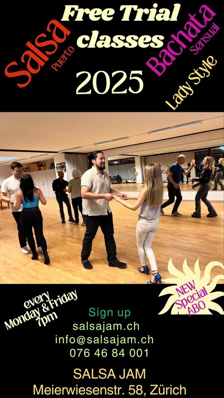 Bachata Sensual - Beginner & Intermediate Salsa & Bachata Tanzkurse für Einsteiger und Fortgeschrittene Montag 18:00 Uhr - Salsa Lady Style / Openlevel 19:00 Uhr - Salsa Puerto Style / Level 1 + 2 20:00 Uhr - Bachata Sensual / Level 1 + 2 21:00 Uhr - Kizomba Urban / Level 1 + 2 Freitag 18:30 Uhr - Bachata Sensual / Level 1 + 2 19:30 Uhr - Salsa Puerto Style / Level 1 + 2 20:30 Uhr - Salsa Ladies Style / Openlevel 21:30 Uhr - Kizomba Urban / Level 1 + 2 Anmeldung: info@salsajam.ch 076 468 40 01 https://salsajam.ch/kontakt/ Preise: Schnupperkurs: Gratis (1x1h) 10er-Abo: 250 CHF (10x1h) 20er-Abo: 350 CHF (10x2h) https://salsajam.ch