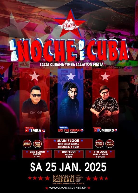★ LA NOCHE DE CUBA ★ DJs Rumbero & Timba, Animation y Ray The Cuban Bananenreiferei by Juanes ★★★ ★ SAMSTAG 25. JANUAR 2025 ★ 4 Dance Floors ★ AB 22 JAHREN ★ DOORS: 21:30 – 04:00 UHR ★ EINTRITT CHF 20.- ★ GRATIS GARDEROBE ★ 400 AUTO PARKPLÄTZE ★ EINTRITT: BEZAHLUNG AN DER KASSE NUR BARGELD ★ GETRÄNKE-BAR: BARGELD & CREDITCARD ★★★ DANCE ANIMATION by RAY THE CUBAN (Cuba) ★★★ ★ 1-MAIN FLOOR: * 100% CUBANO ★ DJ RUMBERO ★ DJ TIMBA 100% Salsa Cubana, Timba – Rumba - Fiesta ★★★ ★ 2ND FLOOR: BACHATA: ★ DJ LUJO 100% Bachata Fusion, Moderna, Clasica, del Recuerdo ★★★ ★ 3RD FLOOR: KIZOMBA: ★ DJ XAVIX Kizomba - Semba - Tarraxinha - Afrohouse - Urban Kiz ★★★ ★4TH FLOOR: SALSA ALLSTYLES ★ DJ GIOVANNI Salsa Allstyles, Puertorriqueña, Clasica, Mambo. ★★★ DATES 2025 LA NOCHE DE CUBA ● Sa 25. Januar 2025 ● Sa 22. Februar 2025 ● Sa 22. März 2025 ● Sa 26. April 2025 ● Sa 24. Mai 2025 ● Sa 28. Juni 2025 ● Sa 26. Juli 2025 ● Sa 23. August 2025 ● Sa 27. September 2025 ● Sa 25. Oktober 2025 ● Sa 22. November 2025 ● Sa 27. Dezember 2025 ★★★ BANANENREIFEREI Pfingstweidstrasse 101 8005 Zürich ★★★ Bienvenidos Juanes Events http://juanesevents.ch/