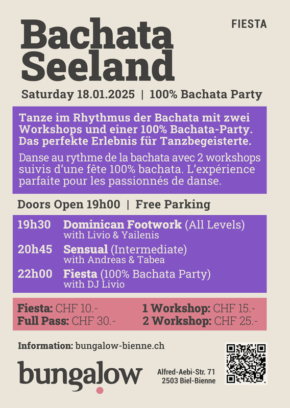 Bachata Night im Bungalow Bienne – Ein Abend voller Leidenschaft und Rhythmus! Zwei mitreissende Workshops und eine 100% Bachata-Party machen diesen Abend zu einem perfekten Erlebnis für Tanzbegeisterte. Die Workshops Dominican Footwork (All Levels) und Sensual Bachata (Intermediate) zeigen die Vielfalt des Bachata. Ab 22:00 Uhr bringt DJ Livio die Tanzfläche zum Glühen. Der Bungalow Bienne, sonst bekannt für seine Salsa-Fiestas, rückt an diesem besonderen Abend einen anderen Tanzstil ins Rampenlicht. Tänzer aller Niveaus sind willkommen, um die Energie und Leidenschaft des Bachata zu erleben. Ein Abend voller Musik, Bewegung und Emotionen! Programm 19:30 Dominican Footwork (All Levels) mit Livio & Yailenis 20:45 Sensual (Intermediate) mit Andreas & Tabea 22:00 Fiesta (100% Bachata Party) mit DJ Livio Preise Full Pass: CHF 30.- Fiesta: CHF 10.- 1 Workshop: CHF 15.- 2 Workshops: CHF 25.- Bachata Night au Bungalow Bienne - Une soirée pleine de passion et de rythme ! Deux workshops et une fiesta 100% bachata font de cette soirée une expérience parfaite pour les passionnés de danse. Les workshops Dominican Footwork (All Levels) et Sensual Bachata (Intermediate) montrent la diversité de la bachata. À partir de 22h00, DJ Livio enflammera la piste de danse. Le Bungalow Bienne, habituellement connu pour ses fêtes de salsa, met en avant un autre style de danse lors de cette soirée spéciale. Les danseurs de tous niveaux sont les bienvenus pour découvrir l'énergie et la passion de la bachata. Une soirée pleine de musique, de mouvements et d'émotions ! Programme 19:30 Dominican Footwork (All Levels) avec Livio & Yailenis 20:45 Sensual (Intermédiaire) avec Andreas & Tabea 22:00 Fiesta (100% Bachata Party) avec DJ Livio Prix Full Pass : CHF 30.- Fiesta : CHF 10.- 1 Workshop: CHF 15.- 2 Workshops: CHF 25.- www.bungalow-bienne.ch