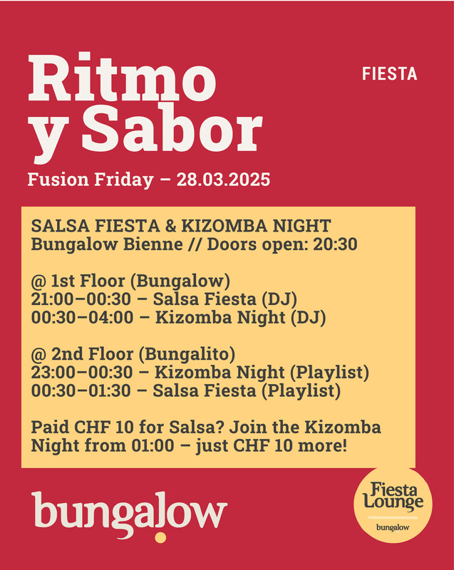 FUSION FRIDAY – 28.03.2025 SALSA FIESTA & KIZOMBA NIGHT Bungalow Bienne // Doors open: 20:30 @ 1st Floor (Bungalow) 21:00–00:30 – Salsa Fiesta (DJ) 00:30–04:00 – Kizomba Night (DJ) @ 2nd Floor (Bungalito) 23:00–00:30 – Kizomba Night (Playlist) 00:30–01:30 – Salsa Fiesta (Playlist) Paid CHF 10 for Salsa? Join the Kizomba Night from 01:00 – just CHF 10 more! www.bungalow-bienne.ch