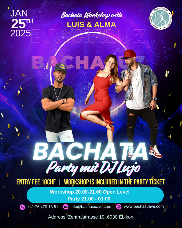 🎉 Bachata Night – Let’s Dance! 💃🕺 📅 Datum: Samstag, 25. Januar 2025 ⏰ Start: 20:00 Uhr – Workshop mit Luis & Alma 🎧 Ab 21:00 Uhr: Party mit DJ Lujo 📍 Location: Zentralstrasse 10, 6030 Ebikon Tauche ein in die Welt des Bachata! 👉 20:00 Uhr – Mitreißender Workshop mit den talentierten Luis & Alma – perfekt für alle Levels! 👉 21:00 Uhr – Bachata-Party mit den besten Songs von DJ Lujo. 🎟 Eintritt: Workshop + Party = CHF 10 Nur Party = CHF 10 Bring deine Freunde mit und genieße eine unvergessliche Tanznacht! 💃✨ Wir freuen uns auf dich! 🥳