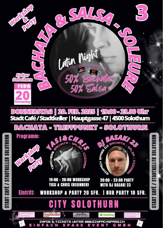 Liebe Tanzbegeisterte,😜🕺💃 (❤️ WE LOVE BACHATA & SALSA - SOLEURE 😉) Herzlich Willkommen zu «BACHATA & SALSA - SOLEURE», deinem Treffpunkt für die monatliche Bachata & Salsa - Party, im reizenden Stadtkeller Solothurn, in der atemberaubenden City von Solothurn. Im charmanten Ambiente des Stadt Cafés / Stadtkeller in Solothurn laden wir euch zu einem unvergesslichen Abend voller Romantik, Leidenschaft und Rhythmus ein 💃🕺😜! Lasst uns an diesem besonderen Abend die Magie des Tanzes erleben und die Herzen im Takt schlagen. Tanze zu den verführerischen Klängen der Bachata und den lebendigen Rhythmen der Salsa. Ob als Paar oder solo, diese Nacht verspricht, eure Herzen höher schlagen zu lassen und euch unvergessliche Momente zu schenken. Highlights des Abends: 19:00 - 20:00 Bachata Workshop mit Yasi & Chris (Beginner Level) 20:00 - 23:00 Party mit DJ BASAKI 23 (50% Bachata & 50% Salsa) Das schöne Stadt Café, welches von Schuan Tahir geführt wird, liegt gleich oberhalb des Stadtkellers im Parterre und hat am Donnerstag von 9:00 bis 21:00 Uhr geöffnet. Anschliessend sind während der Party weiterhin bis 23:00 Uhr Getränke erhältlich. Triff dort vor dem Event neue Leute, tausche Geschichten aus und bereite dich vor in den leidenschaftlichen und sinnlichen Tanz von Bachata & Salsa einzutauchen. Erlebe einen romantischen Bachata & Salsa Abend im Stadt Café / Stadtkeller Solothurn 😜💃🕺! Unser Hauptmotto: !!! Nicht gross nachdenken «EINFACH SPASS» haben😊!!! Wir freuen uns darauf, diesen magischen Abend mit euch zu teilen! ----------------------------------------------------------------------------------------------------------------- Mit deiner Teilnahme an «BACHATA & SALSA - SOLEURE» willigst du ein, dass wir für Impressionen & Werbemittel, evtl. Bilder&Videos von dir nutzen dürfen - Vielen Dank! ------------------------------------------------------------------------------------------------------------------ BACHATA & SALSA - SOLEURE ist ein FORMAT der «EINFACH SPASS EVENTs» !!! Viel Spass😜🕺💃!!! https://einfachspass.ch/