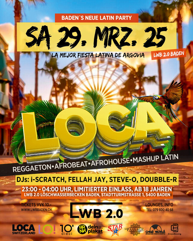 LWB LOCA Switzerland 31 maggio 2025 23:00 festa Loca Latin Party Sei stato a questo evento? Aggiungi le tue foto! Die neue Latin Party im LWB 2.0 in Baden im Kanton Aargau https://lwbbaden.ch Prezzo entrata: CHF 10.00 Share on Facebook Eventi
