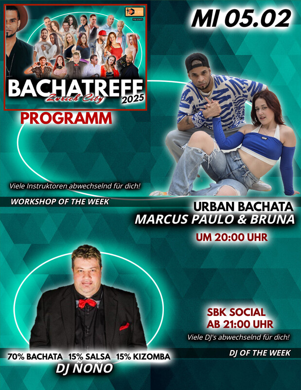2025 ERWARTET EUCH BACHTREFF IM NEUEN FORMAT! Hola Bachateros & Bachateras! BACHATREFF öffnet seine Türen im neuen Jahr für euch mit einem neuen Konzept. Die Tanzszene in der Schweiz wächst und gedeiht. Es ist uns wichtig, euch die gewohnte Qualität des Events zu bieten, dabei aber auch die Vielfalt des aktuellen Angebots zu unterstützen, einen guten Austausch zwischen den Tänzern zu ermöglichen und auch vielversprechenden neuen Lehrern und Instruktoren die Möglichkeit zu geben, ihr Wissen und ihre Begeisterung für Bachata mit euch zu teilen. WHAT IS NEW: Für die Workshops haben wir viele verschiedene Instruktoren "in round" für euch. Auch für die anschliessende Party werden die DJs im Wochentakt rotieren. Zusätzlich haben wir unsere Preise zurück auf den ursprünglichen Eintrittspreis angepasst. Bachatreff ist ein von Dance Spot Zürich organisiertes Event, welches jeden Mittwoch in Zürich stattfindet. Seit nun bereits mehr als 7 Jahren bringen wir neue Tänzer auf die Tanzflächen. Make it your second home! _________________________________________________________ WOCHENPLAN *************** ° 20:00 URBAN BACHATA by Marcus Paulo & Bruna _________________________________________________________ ° 21:00 SBK SOCIAL 70% Bachata 15% Salsa 15% Kizomba by DJ Ñoño _________________________________________________________ ° NEUER EINTRITTSPREIS Workshop + Party Pass 25.- Party Pass 10.- _________________________________________________________ ° LOKAL Labor 5 Club Schiffbaustrasse 3 8005 Zurich https://www.facebook.com/share/15eXFCQRtn/