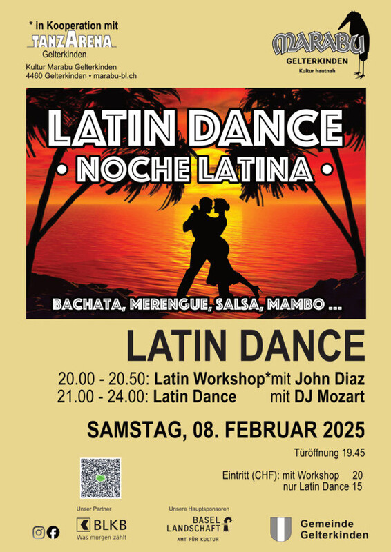 Latin Dance Liebe Salsa Freunde Am Samstag, 6. April startet das Marabu und DJ Mozart im wunderbarem ehemaligen Ambiente des alten Kinos Marabu wieder einen Latin-Salsa Event. Zum Start um 20.00h gibt es einen Latin Mix Work Shop mit dem bekannten Tänzer John Diaz (in Kooperation mit der Tanzschule TanzArena, Gelternkinden) Um zirka 21 Uhr beginnt dann die Party. Kosten: 20sfr.- mit Work Shop, nur Party 15sfr.- Weitere Daten im 2025 : Samstag, 26. April Samstag, 14. Juni Das Marabu Team und DJ mozart heissen euch liebe Tänzerinnen und Tänzer und liebe Freunde der warmen und herzlichen "Music Latino" herzlich willkommen. Wir freuen uns auf euch. https://www.marabu-bl.ch