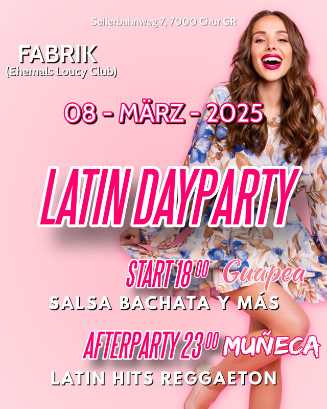 LATIN DAYPARTY - 8. MÄRZ 2025 EVENTLOCAL FABRIK, CHUR (Ehemals Loucy) Seilerbahnweg 7, 7000 Chur GR 🔥 Taucht ein in eine Welt voller Leidenschaft, heißen Rhythmen y alegría pura! Programm: 🌟 Freier Tanzkurs: Von 17:00 - 18:00 Uhr könnt ihr die Basics von Salsa, Bachata & Co. erlernen. 🌞 Guapea - Salsa, Bachata y más: Ab 18:00 bis 23:00 Uhr bringt euch DJ Cigarro & DJ Edi Jo mit den besten Latin-Rhythmen zum Tanzen. 🌙 Muñeca Latin Party: Ab 23:00 Uhr übernehmen DJ Tommy Cuba & Edi Jo und sorgen für heiße Reggaeton & Latin Party Hits – perfekte Afterparty-Vibes! 🍴 Für Verpflegung ist gesorgt: Leckere Speisen und Getränke stehen bereit, um euch durch den Tag und die Nacht zu begleiten. ✨ Special Highlight: Unser Hauptsponsor JW Hair Studio Buchs sorgt dafür, dass ihr nach jeder Tanzrunde wieder top gestylt seid – for free und direkt im Club! Danke an Jonathan Wender und sein Team! 🎟️ Tickets sichern www.eventfrog.ch/latindaychur Seid Teil des ersten Latin Day in Chur – wir freuen uns auf euch! https://www.instagram.com/guapea.muneca?utm_source=ig_web_button_share_sheet&igsh=ZDNlZDc0MzIxNw== https://www.instagram.com/guapea.muneca/