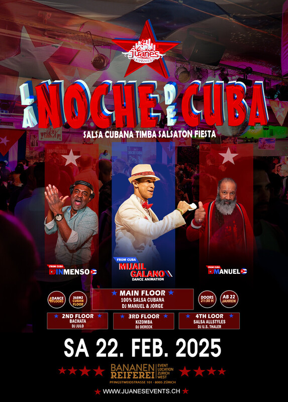 ★ LA NOCHE DE CUBA ★ DJs Manuel & Inmenso Bananenreiferei by Juanes ★ 4 Dance Floors ★ AB 22 JAHREN ★ DOORS: 21:30 – 04:00 UHR ★ EINTRITT CHF 20.- ★ GRATIS GARDEROBE ★ 400 AUTO PARKPLÄTZE ★ EINTRITT: BEZAHLUNG AN DER KASSE NUR BARGELD ★ GETRÄNKE-BAR: BARGELD & CREDITCARD ★★★ MAIN FLOOR: CUBAN DANCE ANIMATION by MIJAIL GALANO. ★★★ ★ 1-MAIN FLOOR: * 100% CUBANO ★ DJ MANUEL ★ DJ INMENSO 100% Salsa Cubana, Timba – Rumba - Fiesta ★★★ ★ 2ND FLOOR: BACHATA: ★ DJ LUJO 100% Bachata Fusion, Moderna, Clasica, del Recuerdo ★★★ ★ 3RD FLOOR: KIZOMBA: ★ DJ DERECK Kizomba - Semba - Tarraxinha - Afrohouse - Urban Kiz ★★★ ★4TH FLOOR: SALSA ALLSTYLES ★ DJ U.S. THALER Salsa Allstyles, Puertorriqueña, Clasica, Mambo. ★★★ DATES 2025 LA NOCHE DE CUBA ● Sa 22. Februar 2025 ● Sa 22. März 2025 ● Sa 26. April 2025 ● Sa 24. Mai 2025 ● Sa 28. Juni 2025 ● Sa 26. Juli 2025 ● Sa 23. August 2025 ● Sa 27. September 2025 ● Sa 25. Oktober 2025 ● Sa 22. November 2025 ● Sa 27. Dezember 2025 ★★★ BANANENREIFEREI Pfingstweidstrasse 101 8005 Zürich ★★★ SEARCH MAP https://search.ch/.../Bananenreiferei,Z%C3%BCrich... ★★★★ FOLLOW US in INSTAGRAM Noche Cubana https://www.instagram.com/noche_cubana_juanes/ ★★★ OFFICIAL JUANES EVENTS FACEBOOK https://www.facebook.com/juanesevents ★★★ Bienvenidos Juanes Events http://juanesevents.ch/