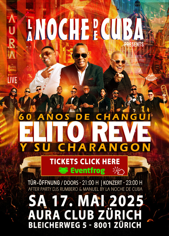 Juanes Events Zürich Presents: ★ ELITO REVE Y SU CHARANGON ★ Live in ZÜRICH ★ Samstag 17. MAI 2025 AURA CLUB Elito Revé y su Charangón son uno de los grupos más influyentes en la historia de la Salsa & Timba Cubana, conocidos por su estilo único y su energía inigualable, han dejado un legado duradero en la Música Latina. ●●● ► PREVENTA // VORVERKAUFT ► TICKETS BY EVENTFROG CHF 35. https://eventfrog.ch/elitoreveZurich ●●●● ABENDKASSE CHF 40.- ●●●● ► PARTY START@ AURA Club von 21:00 BIS 04:00 Uhr ► AB 22 JAHREN ► KONZERT 23:00 UHR UND DAUER 90 MIN. + - ► AB 00:30 AFTER PARTY DJs BIS 04:00 UHR ► 100% Salsa Cubana, Timba, Cubaton, Fiesta ●●● Eingang mit VORVERKAUFT Wir haben 2 Eingänge, um Ihnen einen schnellen und effizienten Eintritt zu ermöglichen ★ 2 Scanner mit Juanes Personal am Eingang ★ Die Garderobe ist im ersten Stock ★ Kontrolle des Tons und Umfangs angepasst, um ein gutes Konzert zu genießen. ★ Gehörschutz Stöpsel ●●●● ZEITPLAN: ★ 1. Einlass: 21:00 Uhr ★ Die Party beginnt mit den DJs & Cuban Salsa ★ DJ RUMBERO & DJ MANUEL ★ 2. Konzert von ELITO REVE Start 23:00 Uhr und dauer 90mint + - ●●●● AFTER PARTY mit LA NOCHE DE CUBA ★ After Party ab 00:30 Uhr ★ Ab 00:30 Uhr können Sie die After Party bis 04:00 Uhr besuchen. ★ Eintritt CHF 15.- ●●●● ORT: AURA CLUB Zürich Bleicherweg 5 8001 Zürich ●●●● ★ ANFAHRT ★ ✪ TRAM & BUS ► Weg zur AURA CLUB von Zürich (HB), mit dem Tram Nr. 4, 13, 11 bis PARADEPLATZ, 2Mint. zu Fuss bis Aura Club SEARCH PLAN: https://search.ch/.../AURA-Group-AG,Z%C3%BCrich... ●●●● ★ INFOS & KONTAKT ★ Telf: 079 344 50 92 Mail: juan@juanesevents.ch www.juanesevents.ch ●●●● Elito Revé y su Charangón son uno de los grupos más influyentes en la historia de la salsa cubana. Conocidos por su estilo único y su energía inigualable, han dejado un legado duradero en la música latina. La trayectoria de esta agrupación se remonta a la década de 1950, cuando Elito Revé fundó su propia banda en La Habana, Cuba. Desde entonces, Elito Revé y su Charangón han sido reconocidos por su innovadora combinación de géneros como el son, la Rumba y la Salsa. Su música, llena de ritmo y alegría, se ha convertido en un icono de la cultura cubana y ha sido inspiración para muchos artistas posteriores. Elito Revé, conocido como el “mago de la música cubana”, ha dejado una huella imborrable en la salsa. Su habilidad para fusionar diferentes géneros y su enérgica interpretación en el escenario lo convierten en una figura icónica de la música latina. Su legado perdura a través de su vasto catálogo de éxitos y la continua influencia de su estilo en la música contemporánea. http://juanesevents.ch/