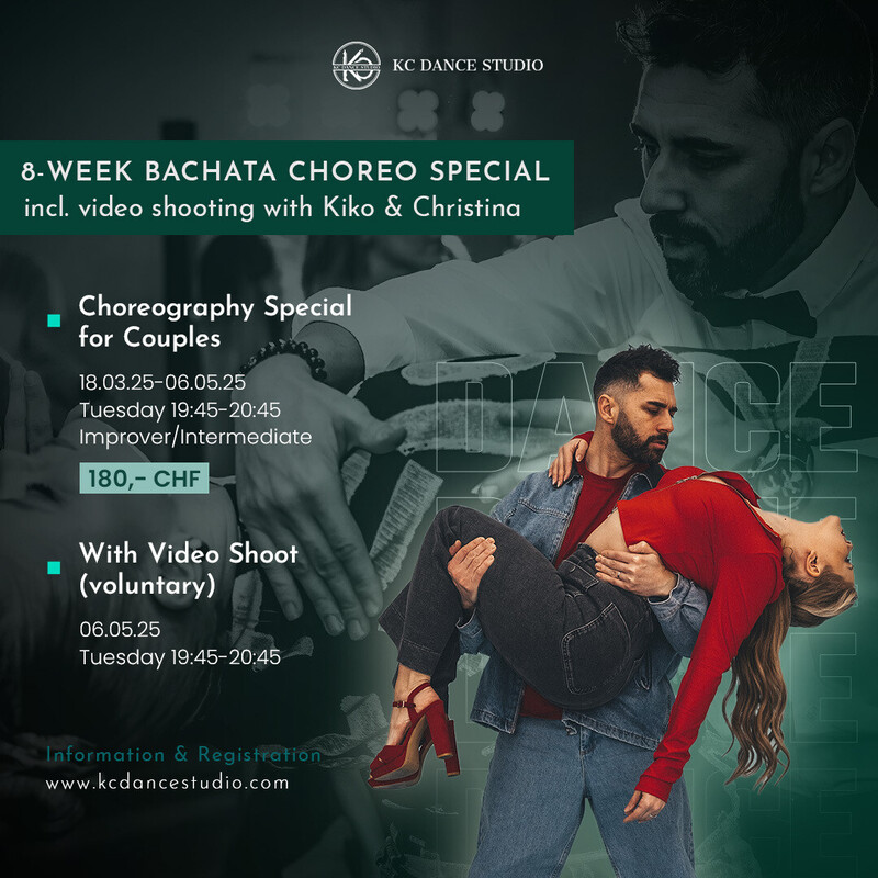 Join Kiko and Christina for an exciting 8-week Bachata choreography special! This immersive experience includes a video shoot with the couple, where you’ll learn a stylish short choreography and capture it on film. Training a choreography not only enhances your coordination and technique but also sharpens your memory for sequences and transitions. Don’t miss this opportunity to elevate your dance skills! For couples. https://kcdancestudio.com/event/choreo-special/