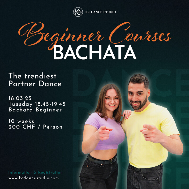 Lerne den beliebten Paartanz Bachata! Am 18. März startet unser neuer Anfängerkurs mit 10 Lektionen für nur 200 CHF pro Person. In diesem Kurs erlernst du die Grundlagen und einfache Figuren, damit du dich direkt zur Bachata-Musik auf der Tanzfläche bewegen kannst. Wenn du nach einem rhythmischen und bewegungsreichen Hobby suchst und Spaß haben möchtest, bist du hier genau richtig. Melde dich jetzt an, die Plätze sind begrenzt! Keine Vorkenntnisse erforderlich, und eine Anmeldung ist auch ohne Partner möglich. https://kcdancestudio.com/beginner-courses/ https://www.eversports.ch/e/course/LP4SI_u