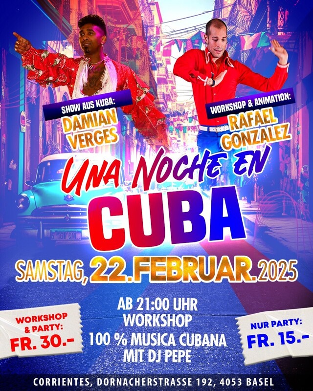 🇨🇺 Una Noche en Cuba 🇨🇺 Samstag, 22. Februar 2025 Seid bereit für eine heisse Fiesta, direkt hier im Corrientes, Basel! Wir bringen euch kubanische Stimmung pur. 🎶 100% Música Cubana 🇨🇺 Unsere Tanzfläche wird zum Schauplatz der besten kubanischen Hits aller Zeiten! Von Timba bis Son, von Rumba bis Cubaton - lasst euch von den mitreissenden Rhythmen entführen. 🎧 DJ PEPE (BS) 🎧 DJ Pepe ist weit mehr als nur ein DJ. Mit technischem Know-how, musikalischer Expertise und seiner Liebe zur lateinamerikanischen Kultur bringt er Leidenschaft und Feingefühl auf jede Bühne. Seit 25 Jahren ist er eine unverzichtbare Grösse der Schweizer Salsa-Szene und legt bei verschiedenen Events sowie auf internationalen Bühnen auf. An diesem Abend sorgt er für den unverwechselbaren Sound aus Kuba. 🇨🇺 Workshop Salsa Suelta - Rafael Gonzalez 🇨🇺 Wir freuen uns, einen ganz besonderen Gast bei uns willkommen zu heissen! Der talentierte Rafael Gonzalez aus Kuba wird unseren Eröffnungsworkshop leiten. Als charismatischer Tanzlehrer der renommierten Tanzschule Fusion Caribe in Basel bringt er nicht nur seine Leidenschaft für den Salsa, sondern auch die unverwechselbare kubanische Lebensfreude mit. Lasst euch von seinem mitreissenden Stil und seiner Energie anstecken. Workshop: 21:00 Uhr - Rueda de Casino Party ab 22:00 Uhr 📍 Ort: Corrientes in Basel 📍 Dornacherstrasse 192, 4053 Basel Eintritt Party: Fr. 15.- Party & Workshop: Fr. 30.-