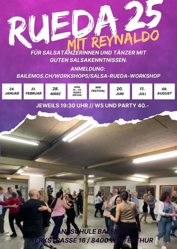 Für Alle die Rueda lieben: Reynaldo ist ein ausgewiesener Könner der Rueda und als Ruedameister in Frankfurt hat er sein Ausnahmetalent bewiesen. Melde Dich an und erlebe Tanzstunden der Extraklasse. Inhalt des Rueda-Clubs sind folgende Themen: Rueda Choreographie, Rueda Show Figuras, Rueda llanta (2 Kreise) und viele mehr. Für die Salsa Rueda Workshops sind gute Salsagrundkenntnisse nötig. Daten für die Workshops jeweils 19:30 Uhr: Fr. Fr. 24.01. || 21.02. || 28.03. || April noch offen || Mai Ruedafestival 23. – 25.05. || 20.06. || 11.07. || 08.08. Kosten: 1 x 2 h 40.- incl. Teilnahme an der Party um 21:30 Uhr https://bailemos.ch/workshops/salsa-rueda-workshop/
