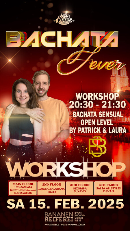 WORKSHOP BY đŸ”„ BACHATA FEVER đŸ”„ ab 20:30 Uhr Bananenreiferei by Juanes đŸ”„đŸ”„đŸ”„ PREIS CHF 25.- INKL. PARTY auf 4 Floors ●●● 20:30 Uhr WORKSHOP BY PATRICK & LAURA VON BACHATA SENCE ● STYLE: SENSUAL ● LAVEL: OPEN LAVEL ●●● Sie brauchen nicht zu buchen, kommen Sie direkt zum Bananenreiferei am Samstag 15. Februar 2025 um 20:15 Uhr. Der Workshop Preis ist CHF 25.- Inkl. Garderobe & Party auf 4 Dance Floors. ●●● đŸ”„ BACHATA FEVER đŸ”„ DJ ONE Barcelona & Dj Cris Alegra, Inkl. Workshop Bananenreiferei by Juanes ●●● ● 4 DANCE FLOORS ● AB 22 JAHREN ● DOORS: 21:30 – 04:00 UHR ● EINTRITT CHF 20.- ● EINTRITT: BEZAHLUNG AN DER KASSE NUR BARGELD ● GRATIS GARDEROBE ● 400 AUTO PARKPLÄTZE ●●● Welcome Juanes Events http://juanesevents.ch/