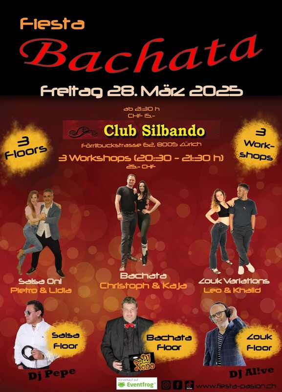 Fiesta Bachata - Deine Social-Dance Party am 4. Freitag des Monates im Club Silbando! Mit 3 Workshops und 3 Floors! Das erwartet dich: *3 Workshops* von 20:30 - 21:30 Uhr (CHF 25.- inkl. Party-Eintritt): - Bachata - mit Christoph & Kaja https://eventfrog.ch/de/p/kurse-seminare/musik-tanz/bachata-workshop-mit-christoph-und-kaja-7289771191623020800.html - Salsa - mit Pietro & Lidia https://eventfrog.ch/de/p/kurse-seminare/musik-tanz/salsa-workshop-mit-lidia-pietro-salsajam-salsa-aarau-7289770887800217507.html - Zouk - mit Leo & Khalid https://eventfrog.ch/de/p/kurse-seminare/musik-tanz/zouk-variations-mit-leo-khalid-7289770373985387322.html *3 Floors* Party ab 21:30 Uhr (CHF 15.-): - Floor 1: Bachata mit DJ Ñoño - Floor 2: Salsa mit DJ Pepe - Floor 3: Zouk mit DJ Al!ive Vorverkauf Workshops und Party-Eintritt via Eventfrog: https://eventfrog.ch/de/p/party/latin-brasil/fiesta-bachata-7289771666355264752.html ●●● WHATSAPP/TELEGRAM: Komm in die WhatsApp- oder Telegram-Gruppe und bleibe über die kommenden Events informiert: Whatsapp: https://chat.whatsapp.com/DHgqcB4Pe8aFmjpYt2v03c Telegram: https://www.t.me/fiestapasion ●●● Fiesta Bachata Daten 2025: jeweils am 4. Freitag des Monates 25.04.2025 23.05.2025 27.06.2025 Sommerpause 22.08.2025 26.09.2025 24.10.2025 28.11.2025 26.12.2025 ●●● Euer Fiesta Pasion Team #bachata #salsa #dance #bachatasensual #bachatadancing #kizomba #merengue #bachatadance #reggaeton #salsadancing #bachatalove #dancer #music #bachatafusion #dancing #hiphop #dancers #bachatalovers #latindance #bachateros #bachatadominicana #musica #love #baile #socialdance #bachatadancers #latino #salsacubana #dembow #romeosantos