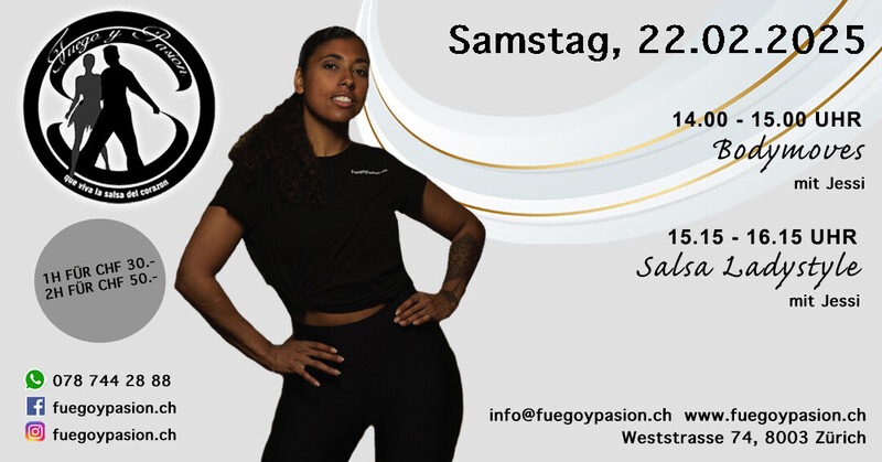 Ladystyle Workshop Salsa mit Jessica Fisicaro Datum:22 . Februar 2025 Dauer: 14.00 - 16.15 Uhr 00 - 15:00 Bodymovements und Isolationen – offen für Ladies & Männer 💃🕺🏻 15:15 - 16:15 Ladystyle – for Ladys 💃 und Leader Willkommen😊 Frauen aller Tanzlevels, die ihren persönlichen Stil im Salsa-Tanz entwickeln möchten. Thema : Drehungen, Body Movements und Isolationen Salsa Ladystyle for Fallower & Leader 🕺🏻💃. Jessi freut sich auf euch und lädt euch herzlich ein, an unserem Ladystyle Salsa Workshop teilzunehmen! Anmeldung unter wwww.fuegoypasion.ch www.fuegoypasion.ch
