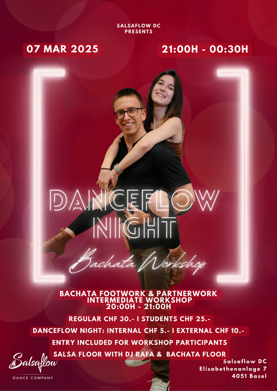 Kommt zu unserer Danceflow Night, in welcher ihr in lockerer Atmosphäre Freunde treffen und miteinander tanzen und üben könnt. Ob Salsa, Bachata oder eine Rueda Cubana, es ist für jeden etwas dabei! Lass Dich von DJ Rafa Rivas auf dem Salsa Floor überraschen. Für den Bachata Floor haben wir eine Playlist, erstellt von unseren Bachateras, welche jede Woche überarbeitet wird. Ihr dürft auch gerne vor Ort eure wünsche anbringen! :) Bachata Workshop um 19:30h Salsa Floor mit DJ Rafa Rivas & Bachata Floor Preis? Salsaflow Schüler CHF 5.- Externe CHF 10.- 21:00h - 00:30h https://www.salsaflow-dc.com/kurse/workshops/
