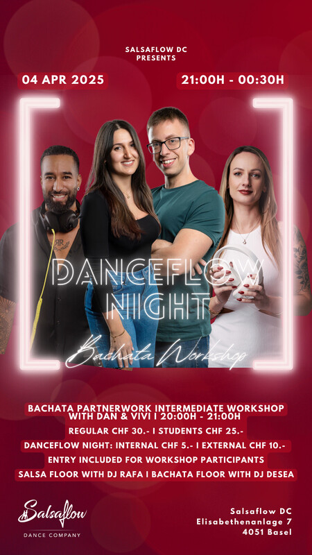 Kommt zu unserer Danceflow Night, in welcher ihr in lockerer Atmosphäre Freunde treffen und miteinander tanzen und üben könnt. Ob Salsa, Bachata oder eine Rueda Cubana, es ist für jeden etwas dabei! Lass Dich von DJ Rafa Rivas auf dem Salsa Floor überraschen. Für den Bachata Floor haben wir eine Playlist, erstellt von unseren Bachateras, welche jede Woche überarbeitet wird. Ihr dürft auch gerne vor Ort eure wünsche anbringen! :) Jeden dritten Freitag im Monat findet noch ein spezieller Workshop statt - mehr Infos auf unserer Website. Salsa Floor mit DJ Rafa Rivas & Bachata Floor mit Dj Desea Preparty Bachata Workshop Preis? Salsaflow Schüler CHF 5.- Externe CHF 10.- 21:00h - 00:30h https://www.salsaflow-dc.com/kurse/workshops/