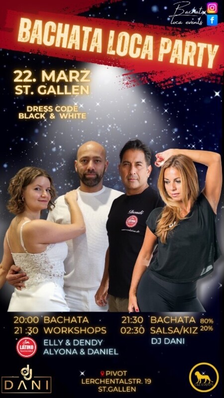 🌟🌟 Bachata Loca Party mit Elly & Dendy, und Alyona & Daniel, mit 2 Floors in St. Gallen! 🌟🌟 Wichtig, wir fangen um 20.:00 Uhr an mit den Workshops 🌹 Dresscode: Weiss & Schwarz🥂 📅 Wann: Samstag, 22 März 2025 📍 Wo: Pivot Bar, Lerchentalstr. 19, St. Gallen 🔗 Event: https://www.eventfrog.ch/bachataloca_marz 🕘 Ab 20:00 Uhr: Bachata Workshop mit Elly & Dendy und Alyona & Daniel 🎧 Ab 21:30 Uhr: Party mit DJ DANI Room 1: BACHATA Room 2: Salsa, Kizomba uvm. Vorverkauf: 20 CHF für Workshop und Party, Abendkasse WS & Party 25 CHF. Nur Party ticket sind auch möglich. Genügend Parkplätze vor dem Haus und an der Lerchentalstrasse 21 zusätzlich auf dem Kiesplatz «Stoffwechselzentrum und Altrimo» Gästeparkplätze!! Bereitet euch vor auf eine unvergessliche Tanznacht bei der Bachata Loca Party am Samstag, dem 22 Marz, im Pivot, St. Gallen, vor! Dieser Event ist ein Muss für alle Bachata, Salsa und Kizomba-Begeisterten und Tänzer, die sich in die lebhaften Rhythmen des Tanzes vertiefen möchten. 🔥🔥🔥 Exklusive Bachata Workshop & Top-DJs! 🔥🔥🔥 Nehmt an unserem Bachata-Workshop für Anfänger sowie Neustarter mit Elly & Dendyum 20:00 teil, perfekt für Tänzer und Tänzerinnen, die noch nicht lange tanzen. Mit DJ Dani garantieren wir eine Nacht voller neuester und grossartiger Bachata-Hits und auch Salsa und Kizomba!\ 📢 Helfet mit, die Bachata Loca Partys zu einem grossen Erfolg zu machen, indem Ihr den Event verbreiten. Der Vorverkauf hat begonnen, sichert euch jetzt die Tickets mit dem Rabatt! Veranstaltungshighlights: 20:00: Open Level Bachata Workshop für Anfänger und intermediate Niveaus von Elly & Dendy und Alyona & Daniel🤩 21:30 - 02:30: Bachata Loco Party mit DJ DANI 🤩 Tickets im Vorverkauf: 20 CHF (25 CHF an der Tür): Workshops plus Party Eintritt zur Bachata Loca Fiesta 10 CHF (15 CHF an der Tür): Nur Eintritt zur Bachata Loca Party Sichert euch euren Platz im Herzen der Bachata, Salsa und Kizomba Szene von St. Gallen. Kommt zu uns für eine Nacht, in der die Rhythmen der Musik uns vereinen. Sichert euch noch heute die Tickets und seit Teil dieser lebendigen Feier! Wir freuen uns auf euch! Euer Bachata Loca Events Team 💃🕺 https://ce-events.ch