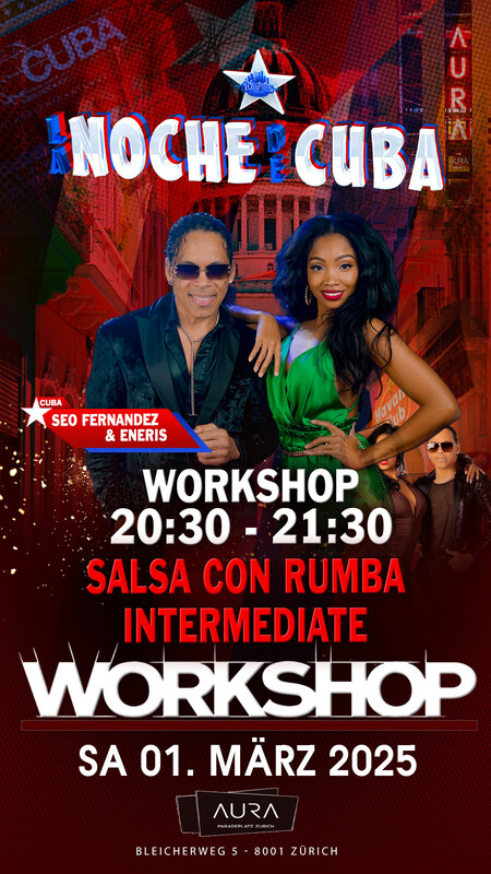 WORKSHOP BY SEO FERNANDEZ & ENERIS (Cuba) ● 20:30 bis 21:30 Uhr ● STYLE: SALSA CON RUMBA ● LAVEL: INTERMEDIATE Sie brauchen nicht zu buchen, kommen Sie direkt zum AURA Club am Samstag 01. März um 20:15 Uhr. Der Workshop Preis ist CHF 25.- Inkl. Garderobe & Party auf 2 Dance Floors. ★★★ ★ LA NOCHE DE CUBA ★ 11 Years Aniversary AURA Club. ★ SAMSTAG 01 MÄRZ 2024 ★ 2 DANCE FLOORS ★ DOORS: 21:30 – 04:00 UHR ★ EINTRITT CHF 20.- ★ GARDEROBE IM 1. STOCK ★ EINTRITT: BEZAHLUNG AN DER KASSE NUR BARGELD ★ GETRÄNKE-BAR: BARGELD & CREDITCARD ★★★ VERLOSUNG: 3X TICKETS ELITO REVE Y SU CHARANGON SA 17.05.25 AURA CLUB ZÜRICH 2X TICKETS LEONI TORRES SA 12.07.25 AURA CLUB ZÜRICH ★★★ CUBAN SHOWS BY: ★ ZEO FERNANDES, Show & Animation (Italy-Cuba) ★ CUBAN FLEX, Show & Animation (Italy-Cuba) ★ CONVINANDO LA TIMBA, Premier Show (Zürich-Cuba) ★★★ DANCE ANIMATION SUPORTED BY: ★ ALEXANDER MARTINEZ (Cuba) ★ MIJAIL GALANO (Cuba) ★ RAFAEL GONZALEZ (Cuba) ★★★ ● GRATIS BUFFET GEÖFFNET AB 00:30 UHR NACH DER SHOWS & ANIMATION ★★★ ★ 1-MAIN FLOOR: ★ LA NOCHE CUBANA ★v 600 M2 Dance Floor DJ MANUEL DJ INMENSO DJ TIMBA ★★★ ★ 2ND FLOOR: BACHATA: DJ DESEA & DJ LUJO ★★★ AURA CLUB Zürich Bleicherweg 5 8001 Zürich ★★★ Bienvenidos Juanes Events http://juanesevents.ch/