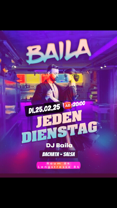 _Baila_ Jeden Dienstag _📅 Di.25.02.25_ PARTY 🆎 20:15 DJ Baila Bachata/Salsa CHF 8.- Student CHF 5.- Raum 84 Langstrasse 84