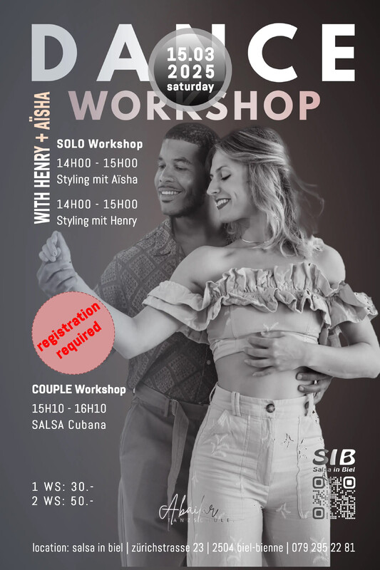 Solo und Couple Workshop Workshop mit Henry & Aisha – Jetzt die Chance nutzen! Verpasst nicht die Gelegenheit, an einem einzigartigen Workshop mit Henry & Aisha teilzunehmen! 🎶💃🕺 Lernt von zwei erfahrenen Tänzern und profitiert von wertvollen Tipps, neuer Technik und jeder Menge Spass. Egal, ob Anfänger oder Fortgeschrittene – dieser Workshop bringt euch auf das nächste Level! 📅 Datum:15.03.2025 📍 Ort: Tanzschule SIB - Salsa in Biel | Zürichstrasse 23 | 2504 Biel | 2. OG ⏰ Uhrzeit: ab 14H00 💰 Preise: 1 WS: CHF 30.- 2 WS: CHF 50.- Meldet euch schnell an und sichert euch euren Platz! 🔥 Anmeldung: https://www.salsainbiel.ch/kursanmeldung/ Wir freuen uns auf euch! 🎉 🇫🇷 🇫🇷 🇫🇷 🇫🇷 🇫🇷 Workshop avec Henry & Aisha – Ne manquez pas cette opportunité ! Ne ratez pas l'occasion de participer à un workshop unique avec Henry & Aisha ! 🎶💃🕺 Apprenez auprès de deux danseurs expérimentés et profitez de précieux conseils, de nouvelles techniques et d’une ambiance pleine d’énergie. Que vous soyez débutant ou avancé, ce workshop vous fera progresser ! 📅 Date : 15.03.2025 📍 Lieu : Tanzschule SIB - Salsa in Biel | Rue de Zurich 23 | 2504 Bienne | 2e étage ⏰ Horaire : à partir de 14h00 💰 Tarifs : 1 WS : CHF 30.- 2 WS : CHF 50.- Inscrivez-vous vite et réservez votre place ! 🔥 👉 Inscriptions : https://www.salsainbiel.ch/fr/kursanmeldung/ Nous avons hâte de vous voir ! 🎉 https://www.salsainbiel.ch