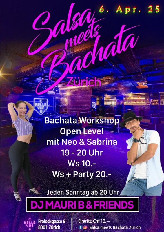 Salsa meets Bachata - Zürich Es wird heiss wenn diese zwei Rhythmen aufeinander treffen. Ein Abend vollgepackt mit dem besten, angesagtesten Sound dieser zwei Stile - da kann niemand mehr ruhig sitzen. Ganz nach dem Motto: BEST MUSIC, ONLY KILLER, NO FILLER ! Salsa und Bachata - all styles Bachata Open Level Workshop mit Neo & Sabrina / Ws 10.- / Ws + Party 20.- Start Workshop: 19 Uhr Start Party: 20 Uhr Dj Mauri B fb & insta: Salsa meets Bachata Zürich