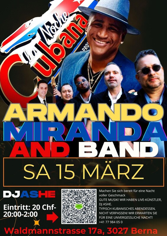 LA NOCHE CUBANA Wir laden Sie ein, zu tanzen und gemeinsam ein tolles Live-Konzert zu genießen. Armando Miranda und seine Band . Salsa . Bachata . Timba . Cubaton Vor und nach dem Konzert . Dj Ashé . Kubanisches und dominikanisches Essen . Waldmannstrasse 17A, 3027 Bern