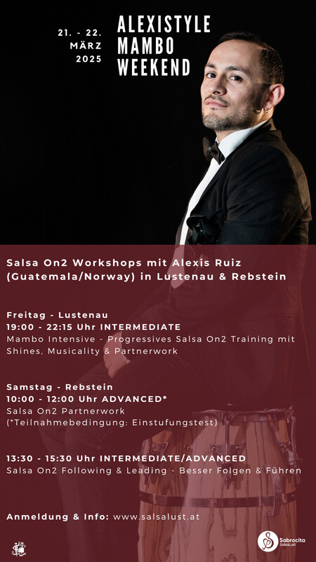 Im März haben wir wieder das Vergnügen, den international bekannten Salsa-Profi und Mambo-Lover Alexis Ruiz bei uns zu begrüßen. Freut euch auf Salsa On2 Workshops, bei denen Alexis euch in lockerer Atmosphäre wertvolle Tipps zu Partnerwork, Technik, Groove und Musikalität vermittelt. ​ Die Plätze sind limitiert, also sichert euch schnell einen Spot! https://forms.gle/3tV3jpbTwU4EKLNWA