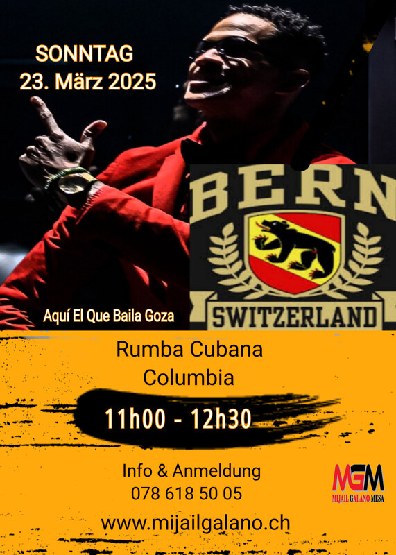A Rumbear Rumberos Sonntag in Bern Rumba Cubana (Columbia) mit Mijail Galano 11:00 - 12:30 Rumba Cubana Columbia Info & Anmeldung 078 618 50 05 Aquí El Que Baila Goza www.mijailgalano.ch