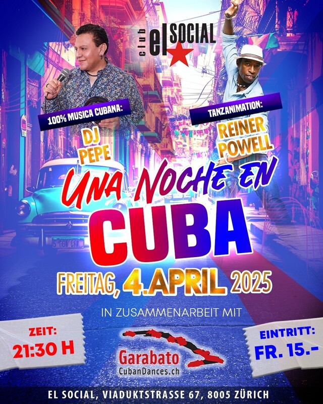 🇨🇺 ¡Una Noche en Cuba! 🇨🇺 Freitag, 4. April 2025 Es ist FREITAG, und wir tanzen zu den besten kubanischen Rhythmen! Eine familiäre Party im Herzen von Zürich. 🎶 100% Música Cubana 🇨🇺 Unsere Tanzfläche wird zum Schauplatz der besten kubanischen Hits aller Zeiten! Von Timba bis Son, von Rumba bis Cubaton - lasst euch von den mitreissenden Rhythmen entführen. 🎧 DJ PEPE (BS) 🎧 DJ Pepe ist weit mehr als nur ein DJ. Mit technischem Know-how, musikalischer Expertise und seiner Liebe zur lateinamerikanischen Kultur bringt er Leidenschaft und Feingefühl auf jede Bühne. Seit 25 Jahren ist er eine unverzichtbare Grösse der Schweizer Salsa-Szene und legt bei verschiedenen Events sowie auf internationalen Bühnen auf. An diesem Abend sorgt er für den unverwechselbaren Sound aus Kuba. 🇨🇺 Tanzanimation Reinier Powell aus Kuba 🇨🇺 Reinier Powell wurde in Kuba geboren und absolvierte seine Ausbildung zum Profitänzer und Tanzlehrer an der E.N.A. in Havanna. Heute arbeitet er selbstständig im In- und Ausland für TV-Programme, Galas, Tanzprojekte, Modeevents und Kongresse. Wir freuen uns auf einen grossartigen Abend mit ihm! 📍 Ort: El Social in Zürich 📍 Viaduktstrasse 67, 8005 Zürich Eintritt Party: Fr. 15.-